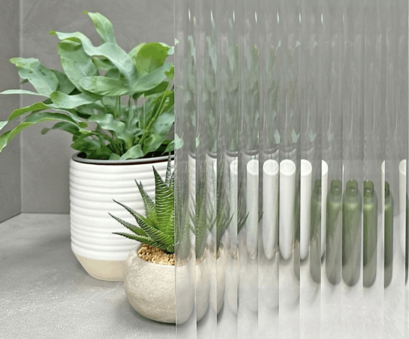 VION Décor Reeded Glass simulates the look of high-end, fluted crystal glass, providing obscured visibility, while allowing excellent light transmission. Ideal for interior glass applications where style and privacy combine, such as restaurant booth dividers and office window partitions. Reeded Glass is a polyester film with a 14mm (standard) or 6mm (narrow) reeded design that runs along the length of the roll. With a 10 year durability, this product meets Class Bs1, d0 when applied to glass or plastic surfaces. Please note, this product has a directional application.